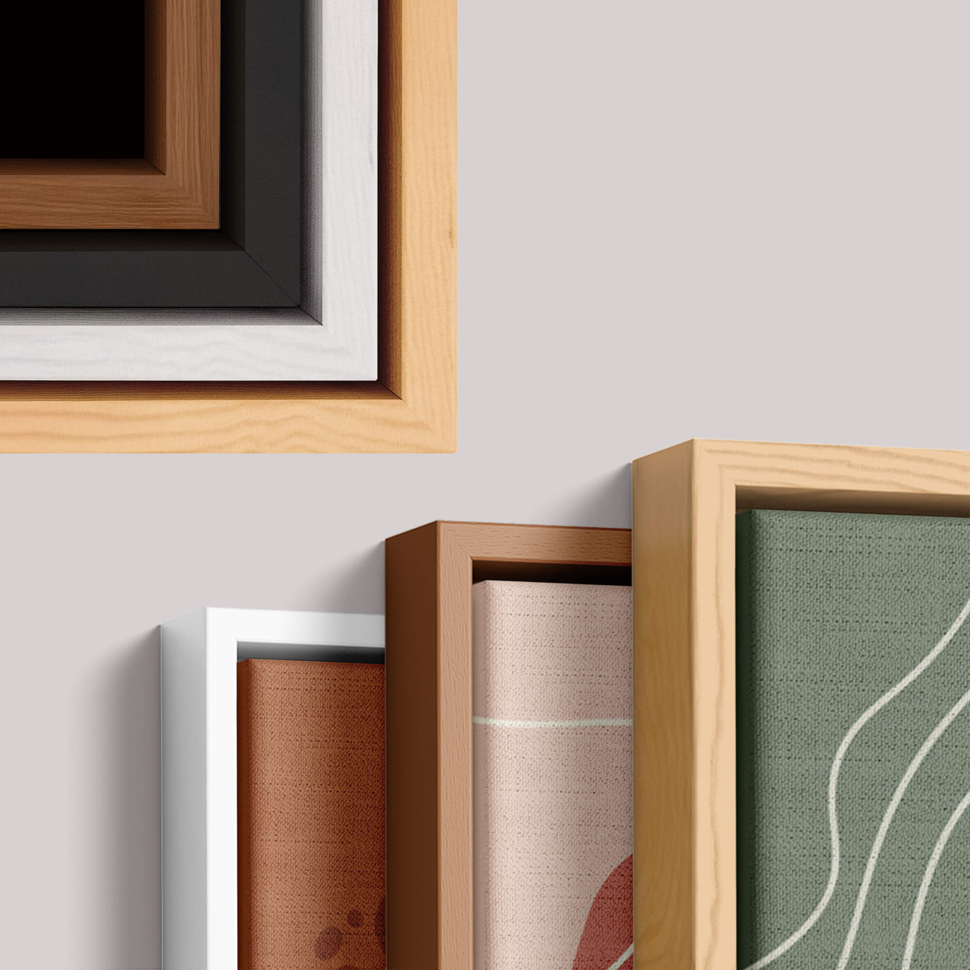Você pode escolher entre Moldura Flutuante, Caixa, Filete ou tecido em Canva. Acabamento premium de alta qualidade e feito em madeira 100% ecológica.