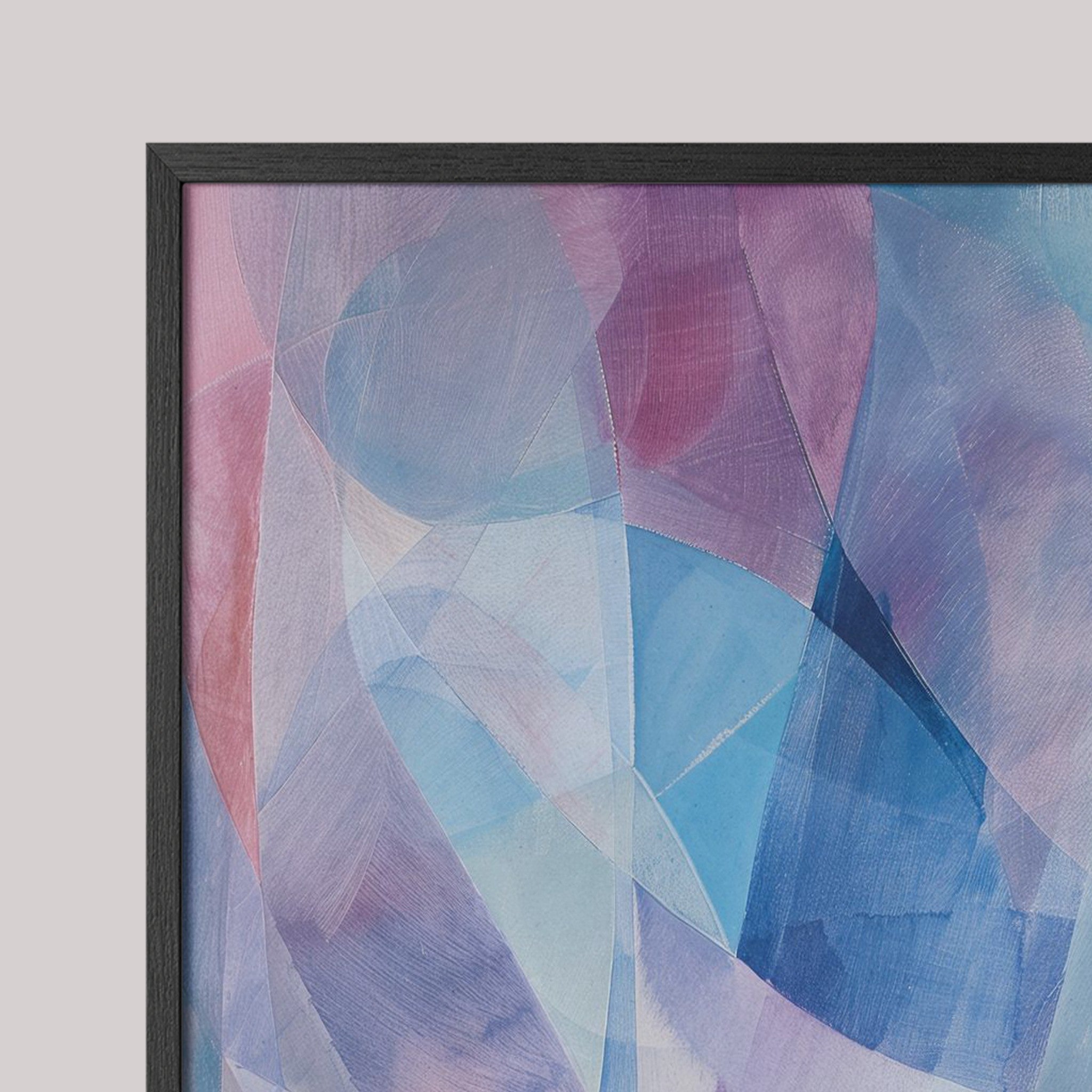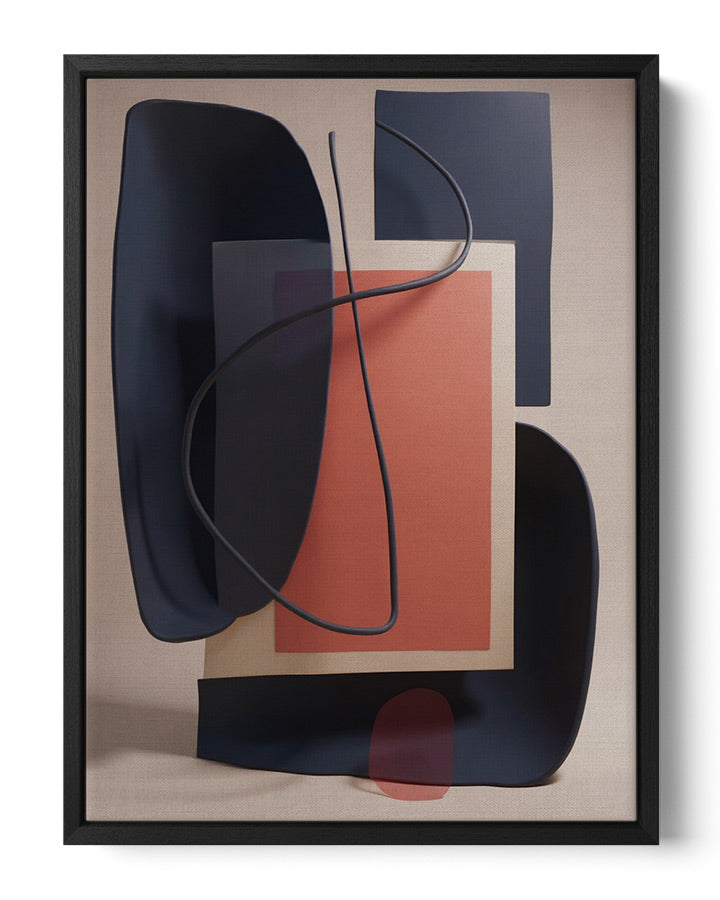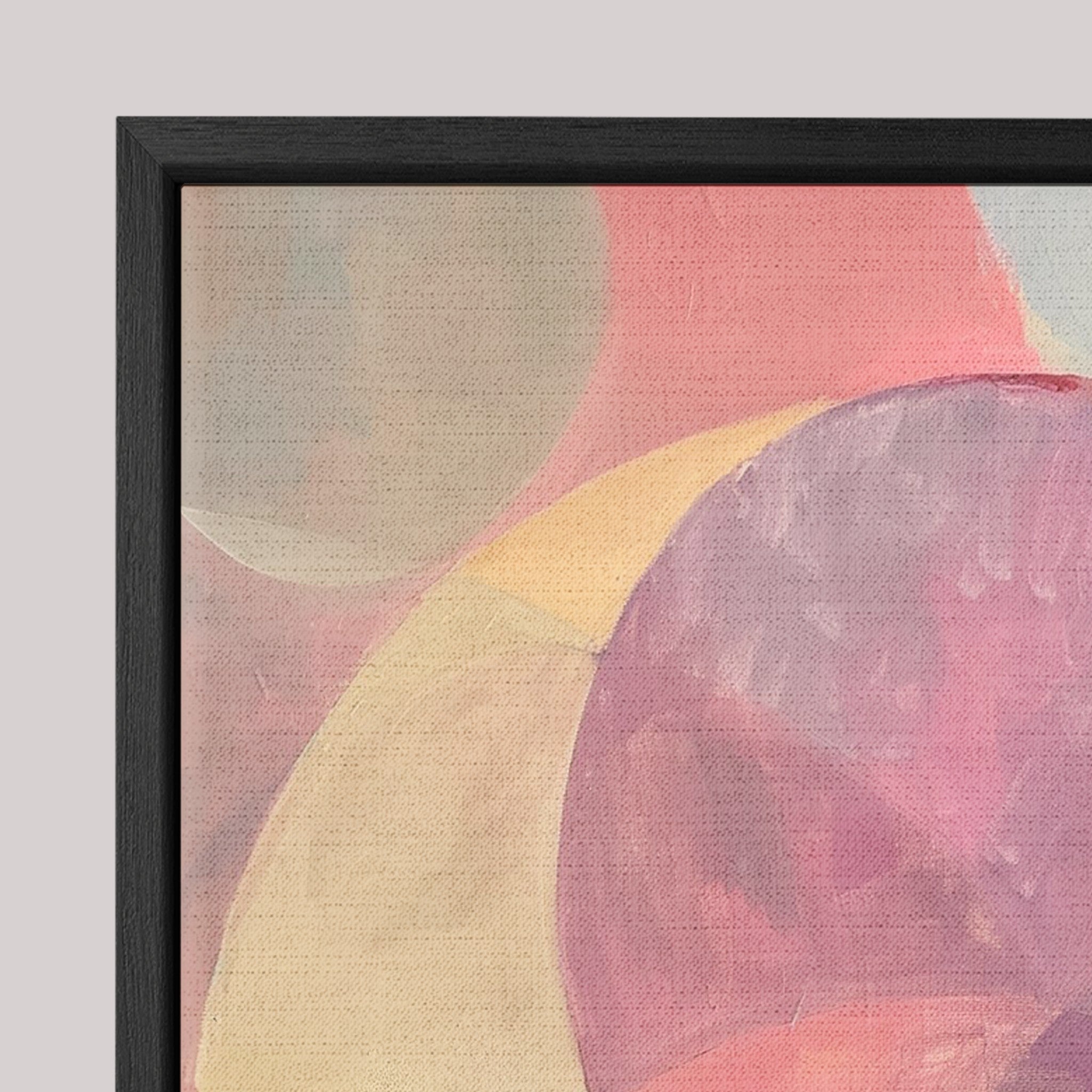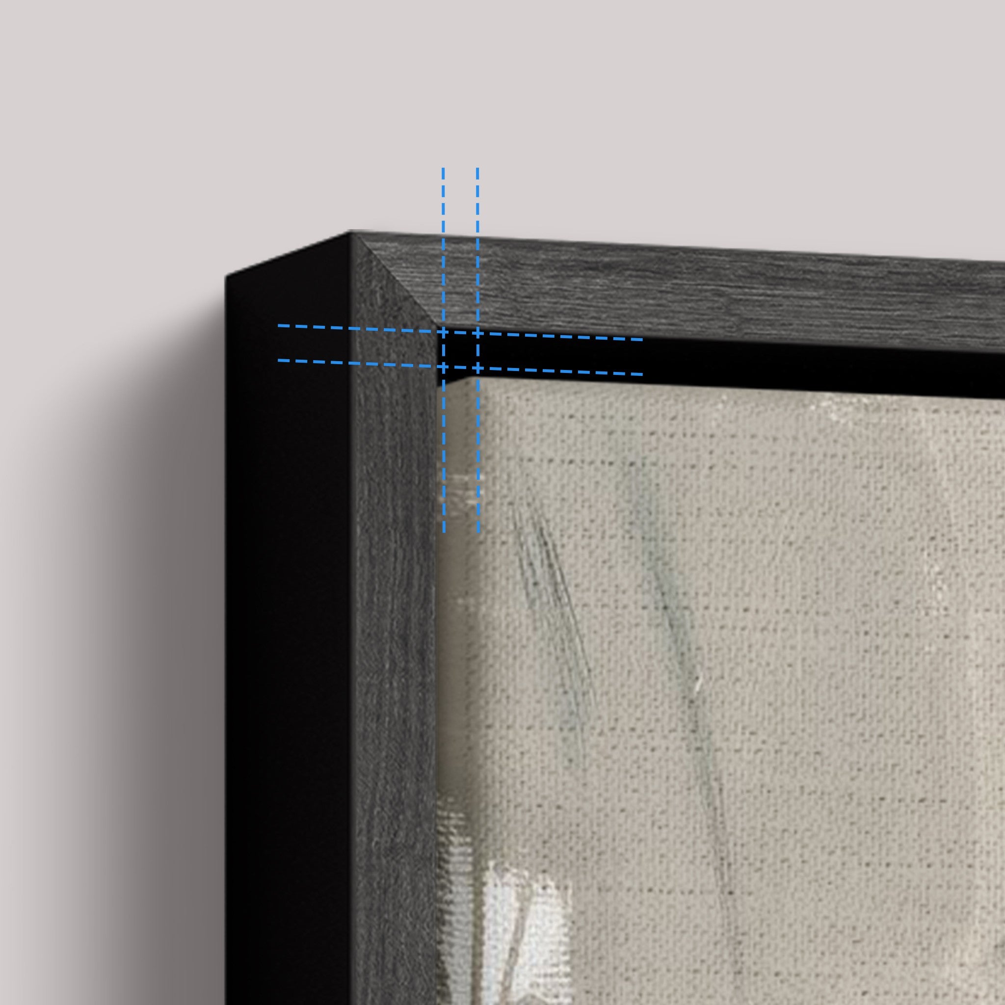 Canvas 100% algodão esticado em chassi, envolto por moldura canaleta (0,7 cm frente × 4,5 cm profundidade). Espaço de 0,75 cm entre tela e moldura, criando efeito flutuante. Sem vidro.