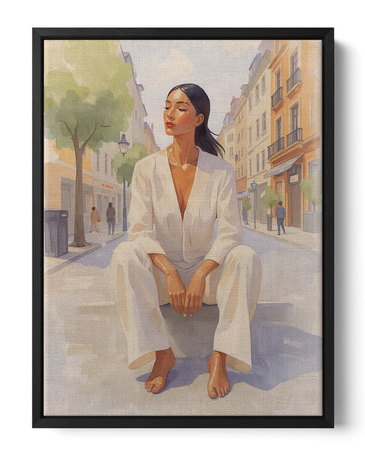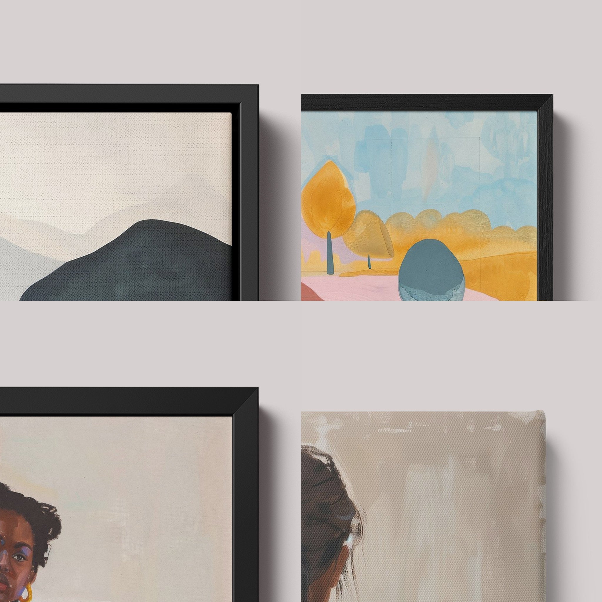 O acabamento entre canvas e moldura fornece profundidade e elegância, realçando a serenidade das representações.