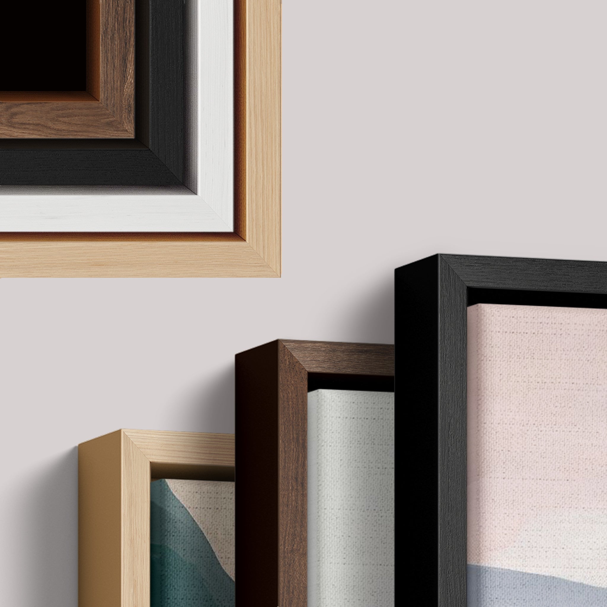 Oferecemos opções de molduras, incluindo Moldura Flutuante, Caixa, Filete, ou Canvas. Todas são projetadas para realçar suas obras com um toque sofisticado e ecológico.