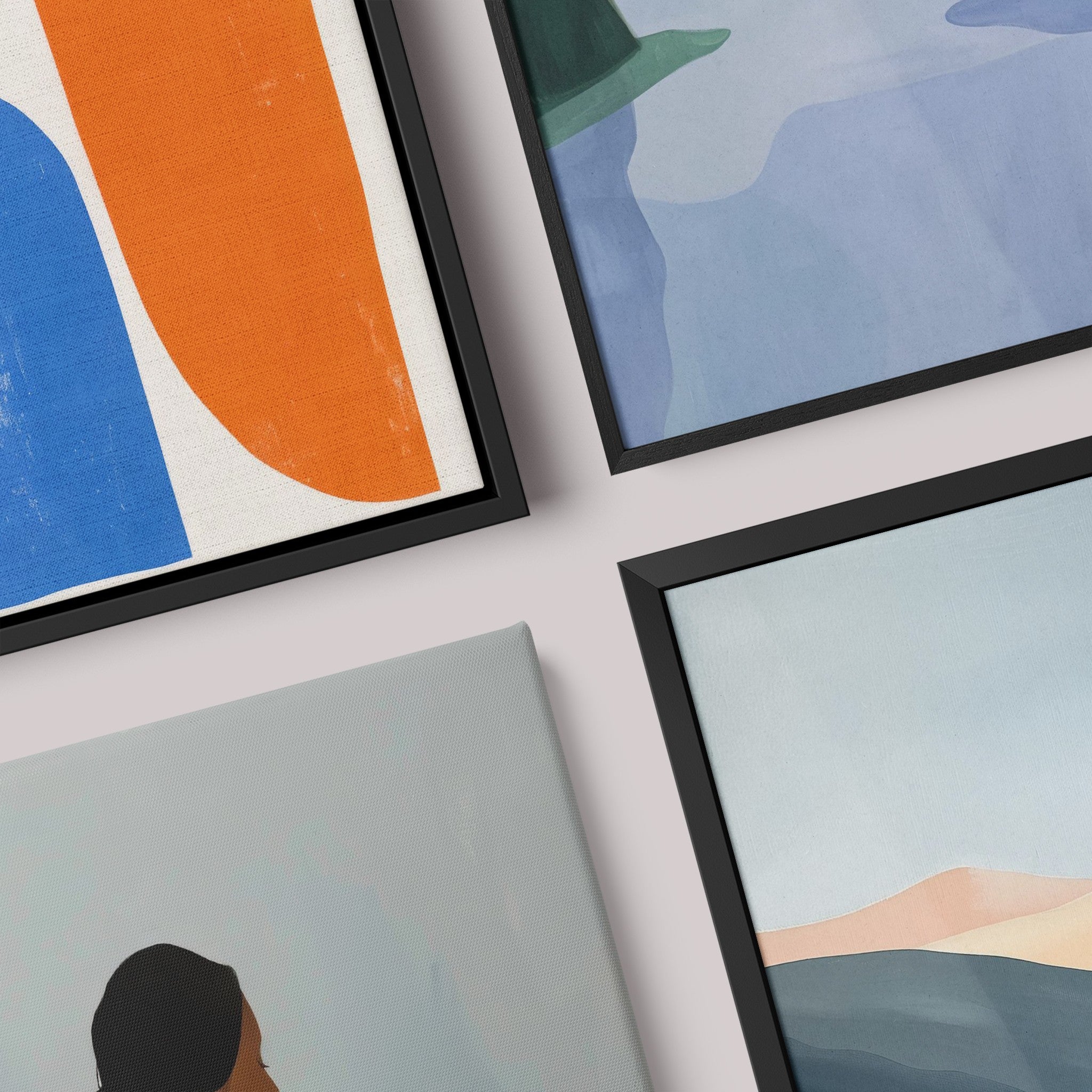 Os quadros possuem acabamento em moldura flutuante, moldura padrão, moldura em alumínio ou canvas. As molduras possuem várias cores que você pode selecionar na página do produto.