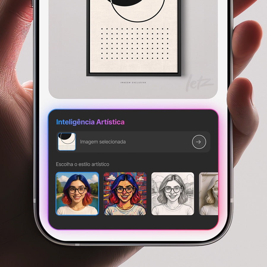Aplique o estilo escolhido na arte. A Inteligência Artística cria uma versão exclusiva, renovando ambientes com elegância e inovação.