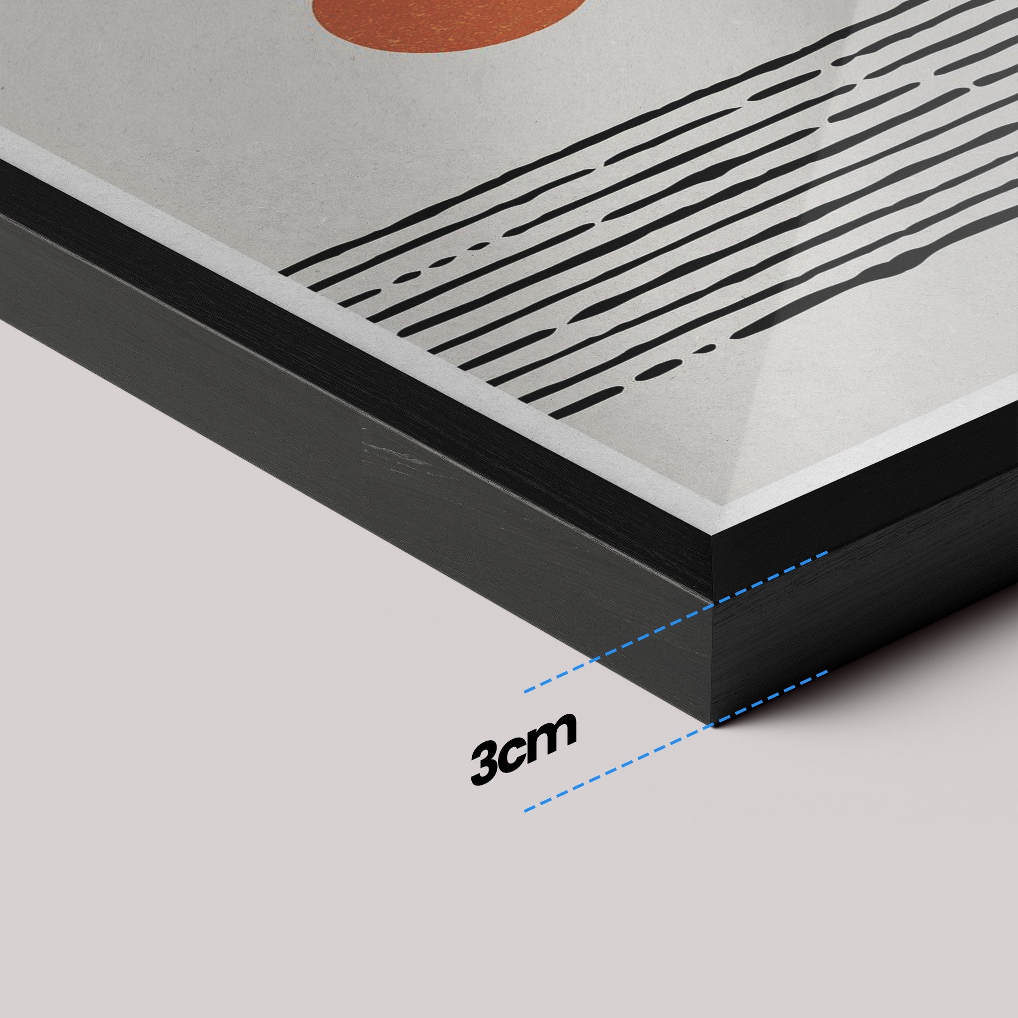 Moldura fina (0,85 cm × 2 cm), fundo em MDF e impressão em vinil fosco de alta resolução com tinta látex ecológica. Com ou sem vidro. Pronta para pendurar.