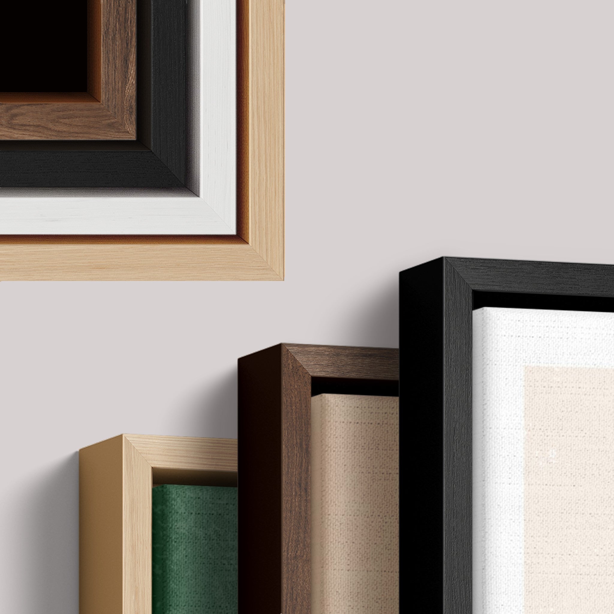 Escolha molduras entre os tipos Flutuante, Caixa, Filete e Canvas sobre tela, todas sustentáveis, com acabamento exclusivo em madeira ecológica.