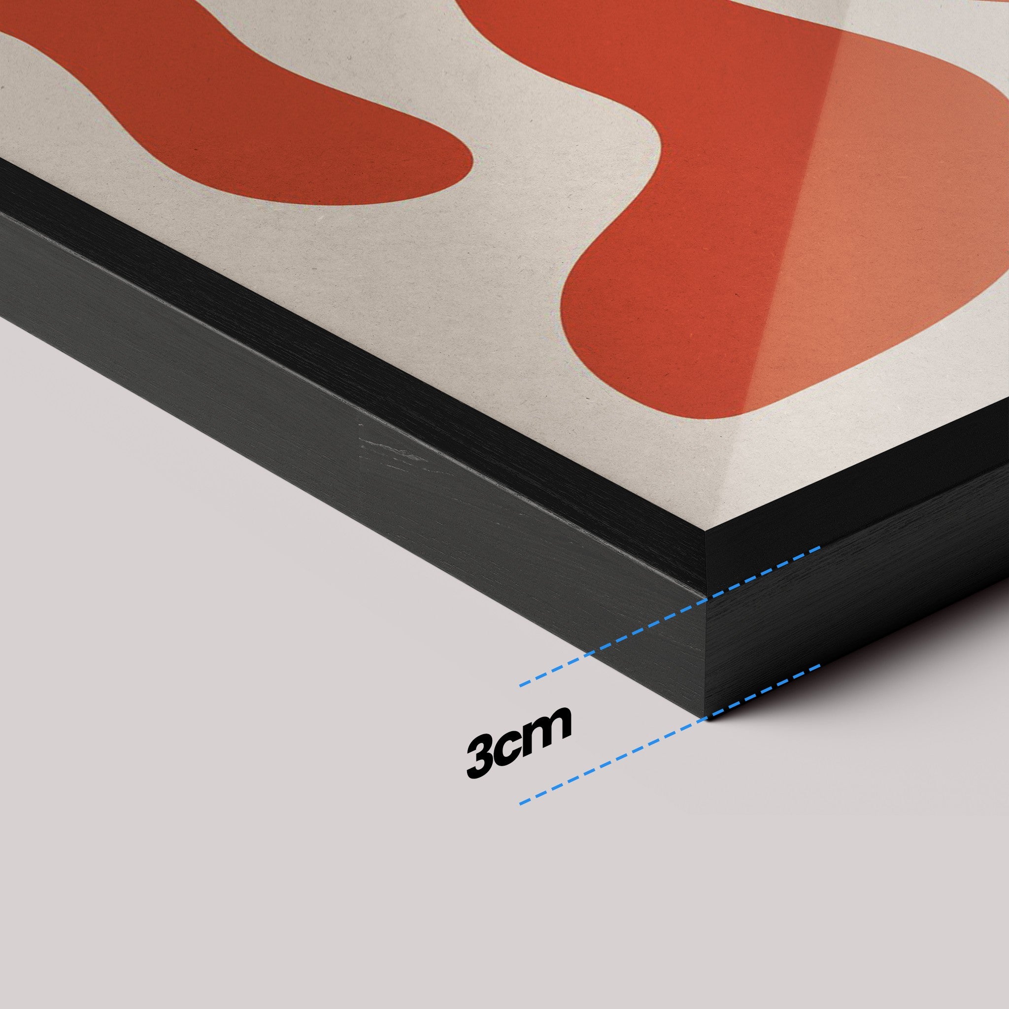 Moldura fina (0,85 cm × 2 cm), fundo em MDF e impressão em vinil fosco de alta resolução com tinta látex ecológica. Com ou sem vidro. Pronta para pendurar.