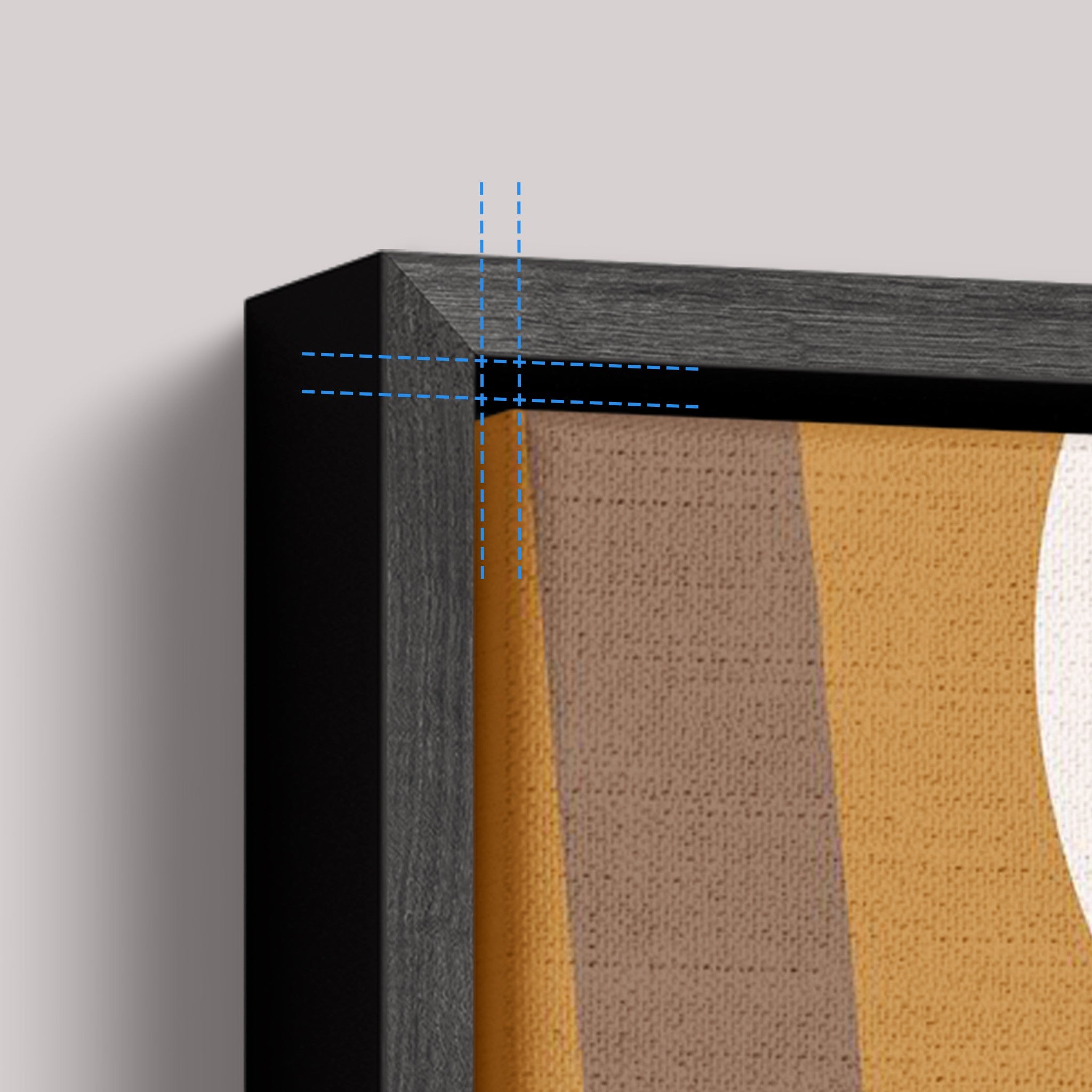 Canvas 100% algodão esticado em chassi, envolto por moldura canaleta (0,7 cm frente × 4,5 cm profundidade). Espaço de 0,75 cm entre tela e moldura, criando efeito flutuante. Sem vidro.