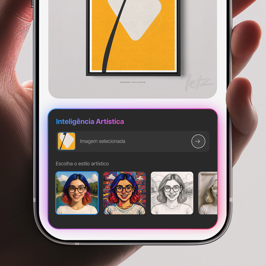 Selecione um estilo artístico e aplique diretamente na imagem enviada. A Inteligência Artística remodela cada peça em uma expressão exclusiva para suas paredes.