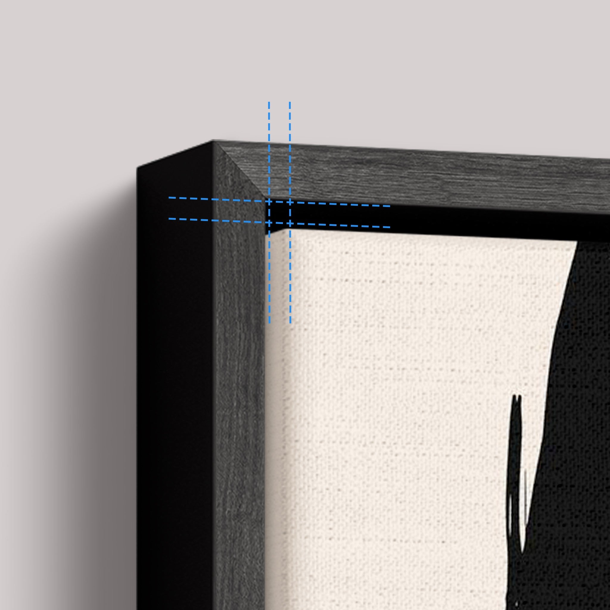 Detalhes finos entre moldura e canvas conferem profundidade e evidenciam cada nuance abstrata.