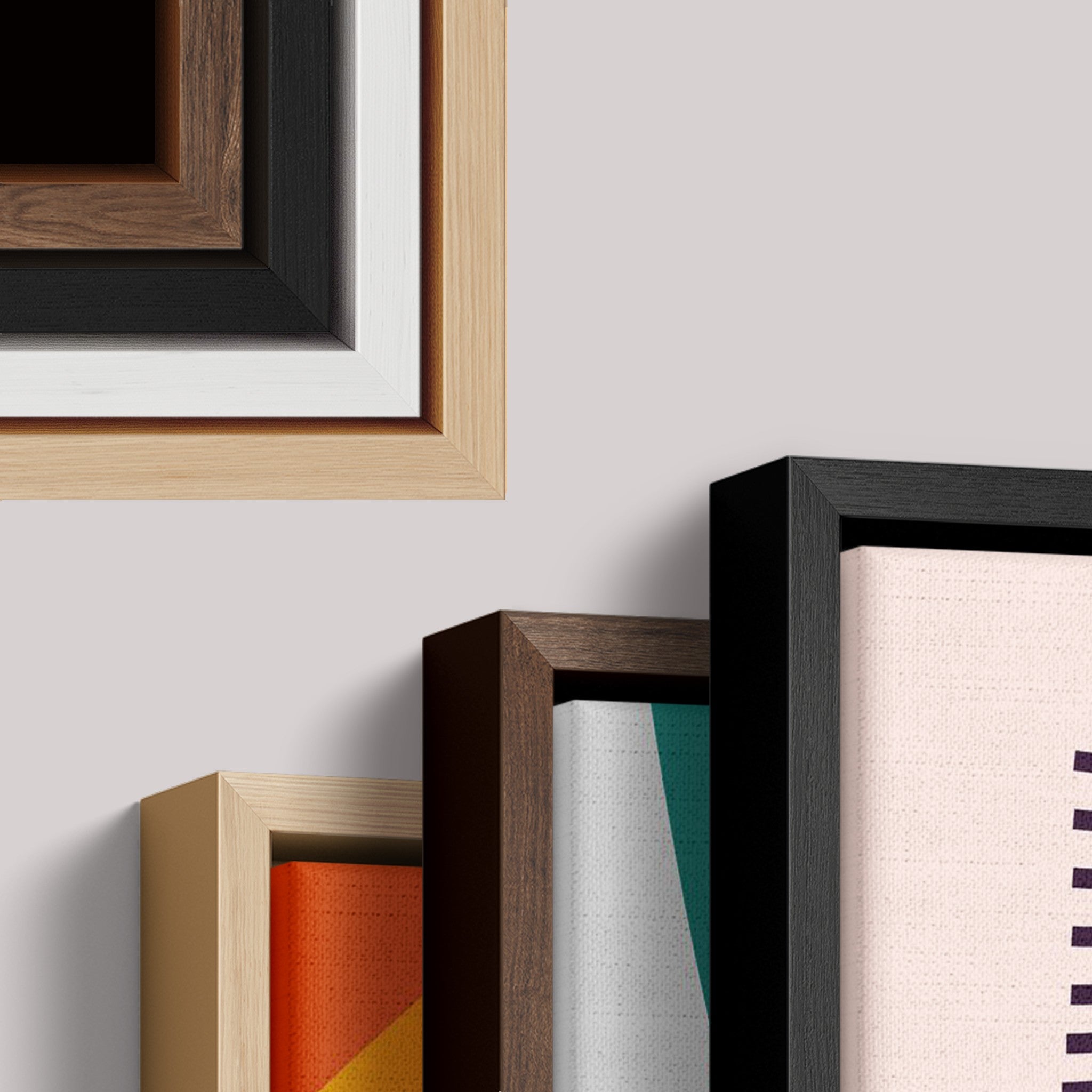 Disponibilizamos molduras sofisticadas em base flutuante, caixa, filete e canvas. Cada moldura é acabada com madeira de qualidade sustentável, para destacar sua arte.