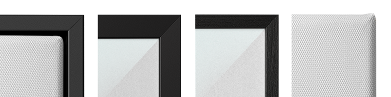 Os quadros possuem acabamento em moldura flutuante, moldura padrão, moldura em alumínio ou canvas. As molduras possuem várias cores que você pode selecionar na página do produto.