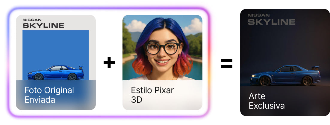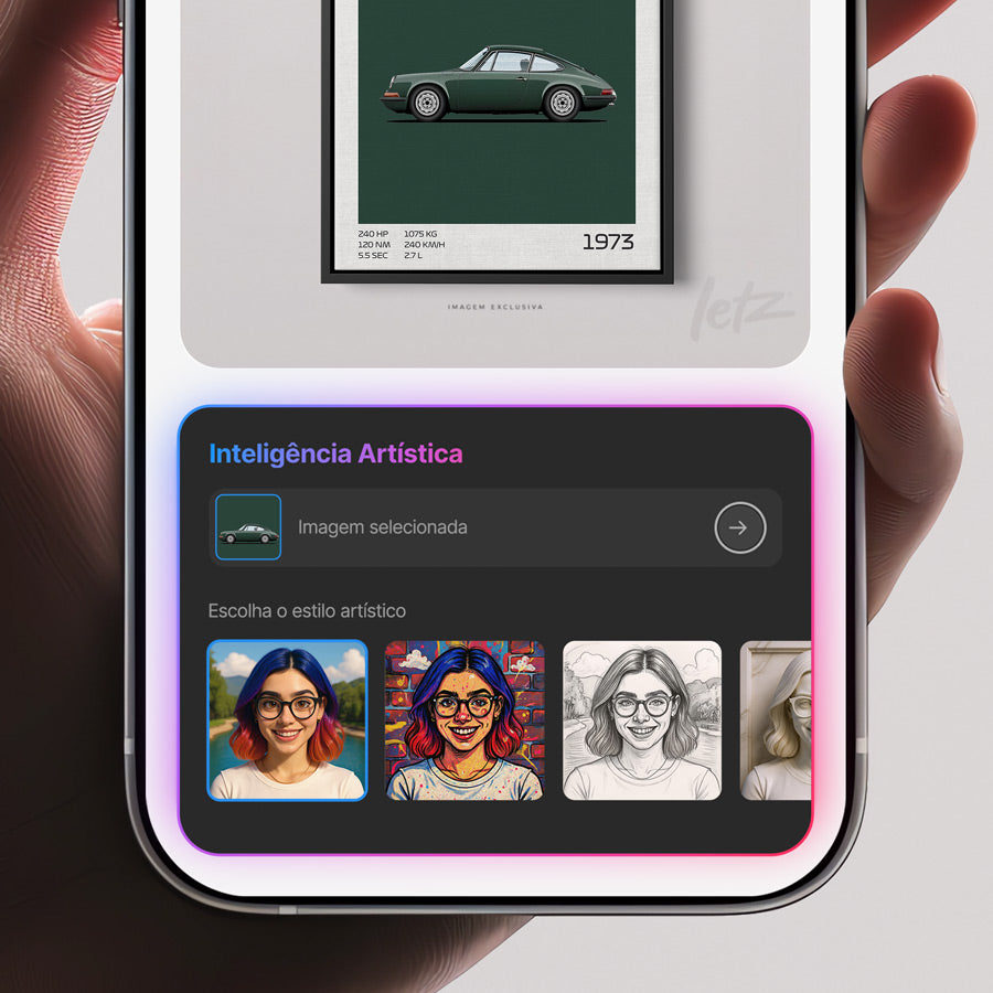O estilo artístico escolhido é aplicado diretamente na imagem enviada. A Inteligência Artística cria uma versão renovada e exclusiva, transformando os clássicos automotivos em obras únicas para sua decoração.