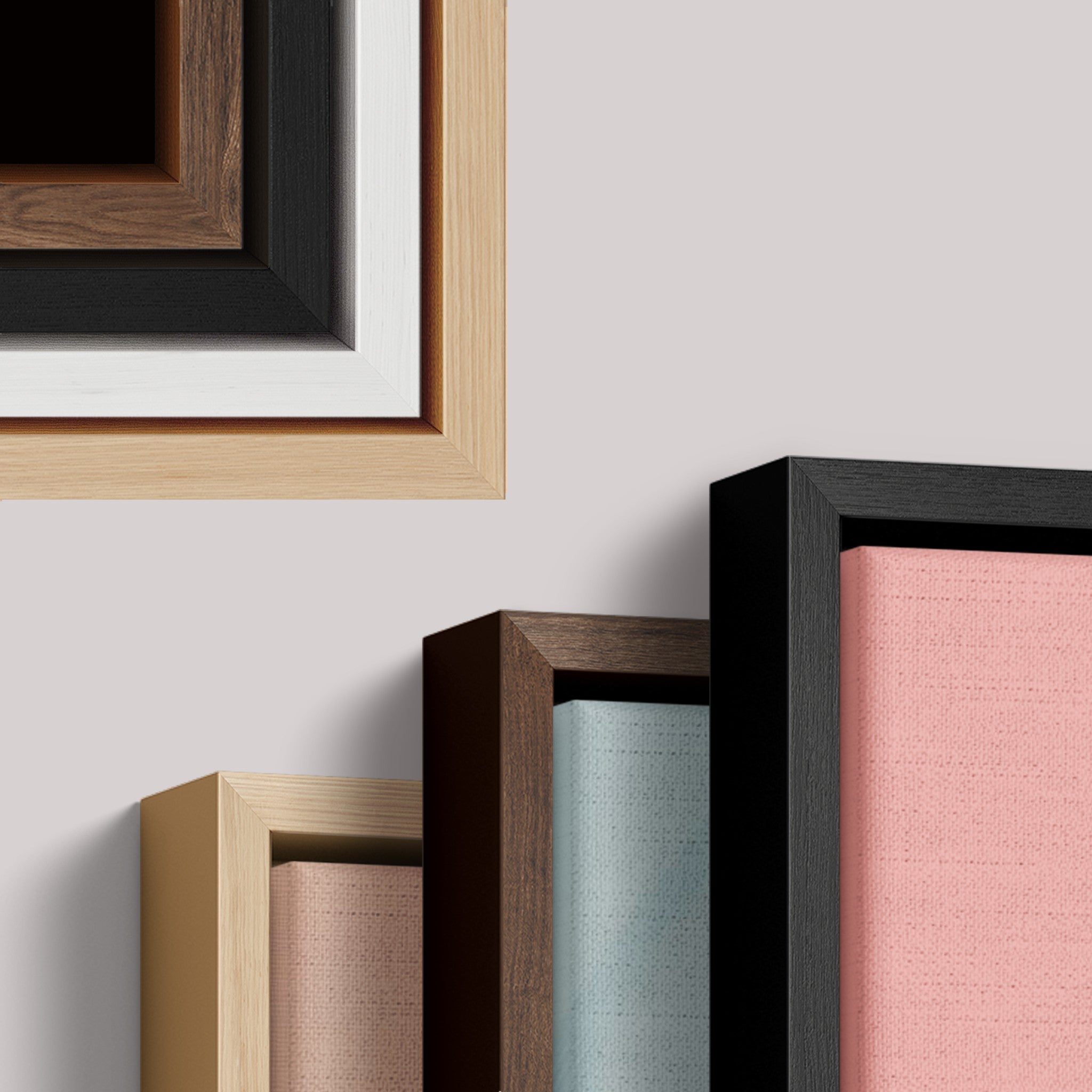 Escolha entre moldura flutuante, caixa, filete ou canvas. Todas feitas com madeira ecologicamente sustentável, oferecendo um acabamento premium.