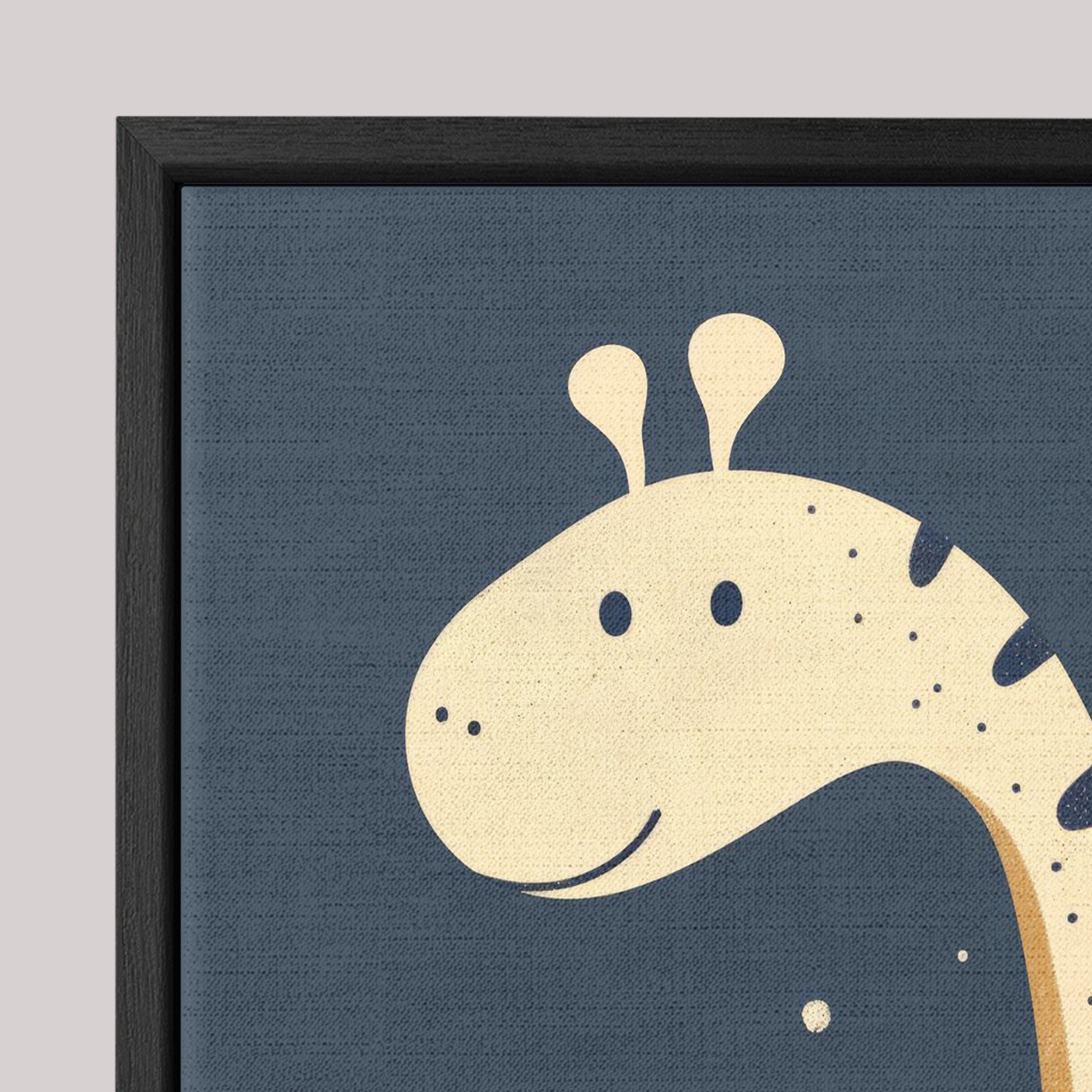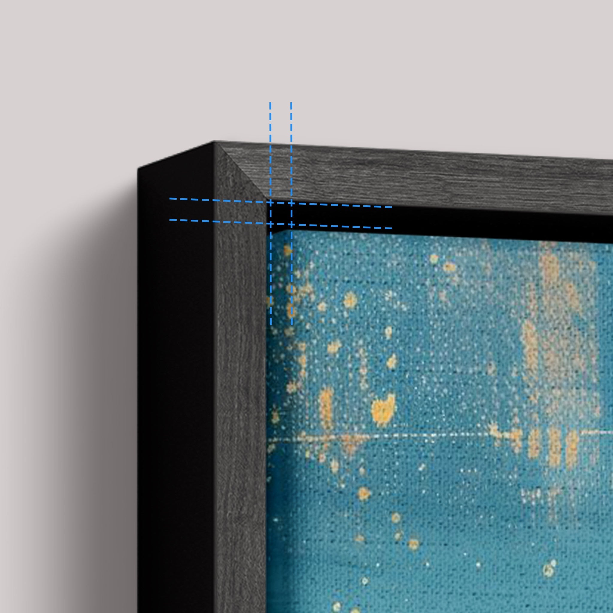 Canvas 100% algodão esticado em chassi, envolto por moldura canaleta (0,7 cm frente × 4,5 cm profundidade). Espaço de 0,75 cm entre tela e moldura, criando efeito flutuante. Sem vidro.