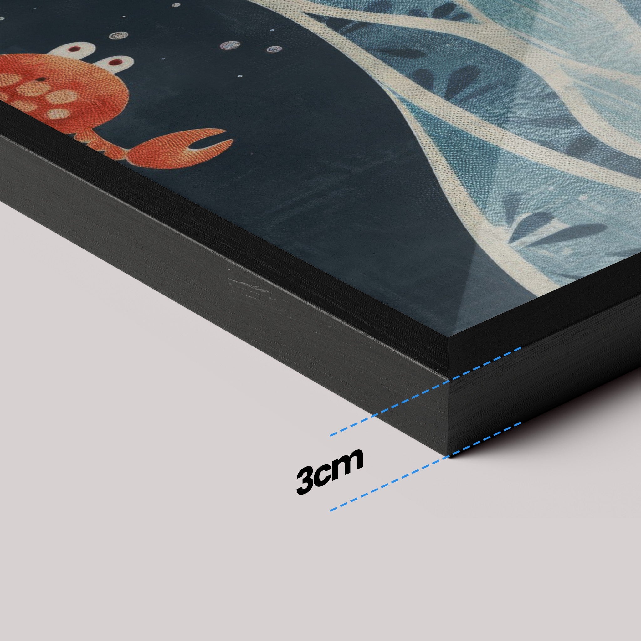 Moldura fina (0,85 cm × 2 cm), fundo em MDF e impressão em vinil fosco de alta resolução com tinta látex ecológica. Com ou sem vidro. Pronta para pendurar.
