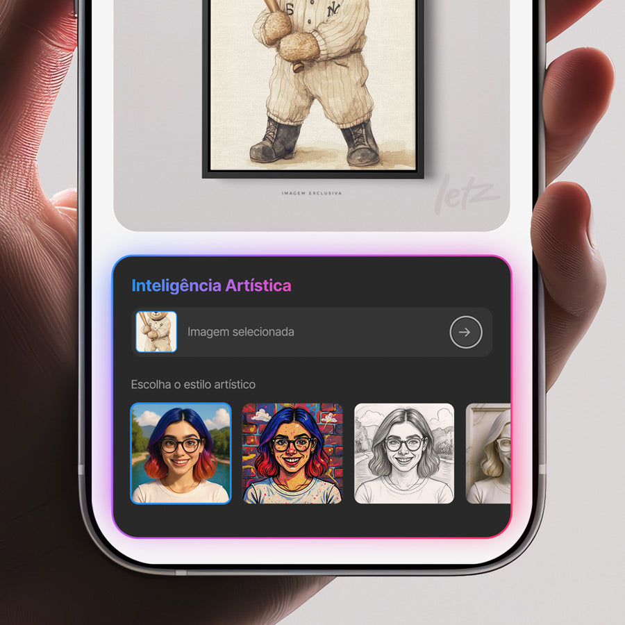 Escolha o estilo que mais combina com você e veja sua imagem ganhar vida. Personalize quadros que refletem nostalgia e carinho, criando algo único.
