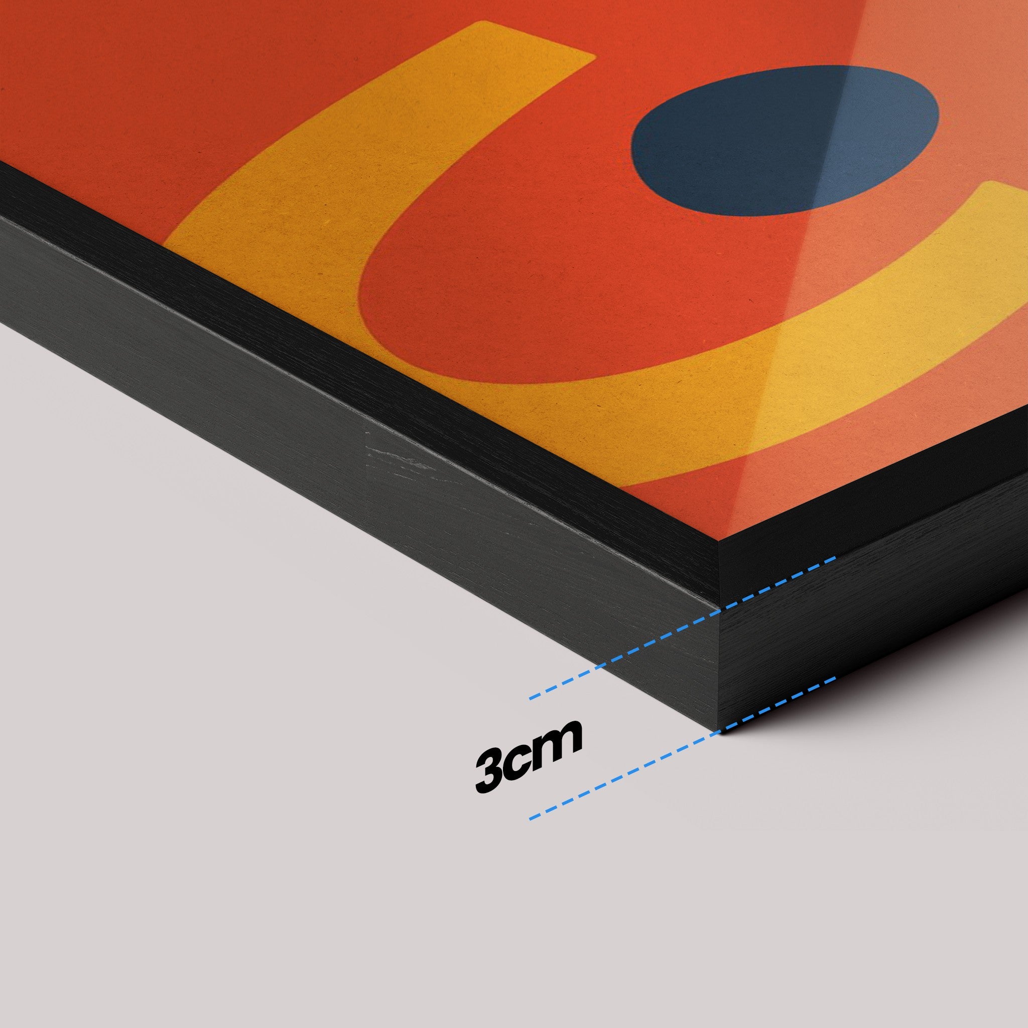 Canvas 100% algodão esticado em chassi, envolto por moldura canaleta (0,7 cm frente × 4,5 cm profundidade). Espaço de 0,75 cm entre tela e moldura, criando efeito flutuante. Sem vidro.