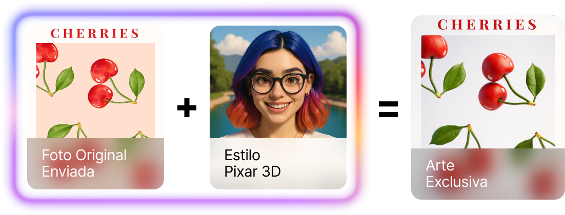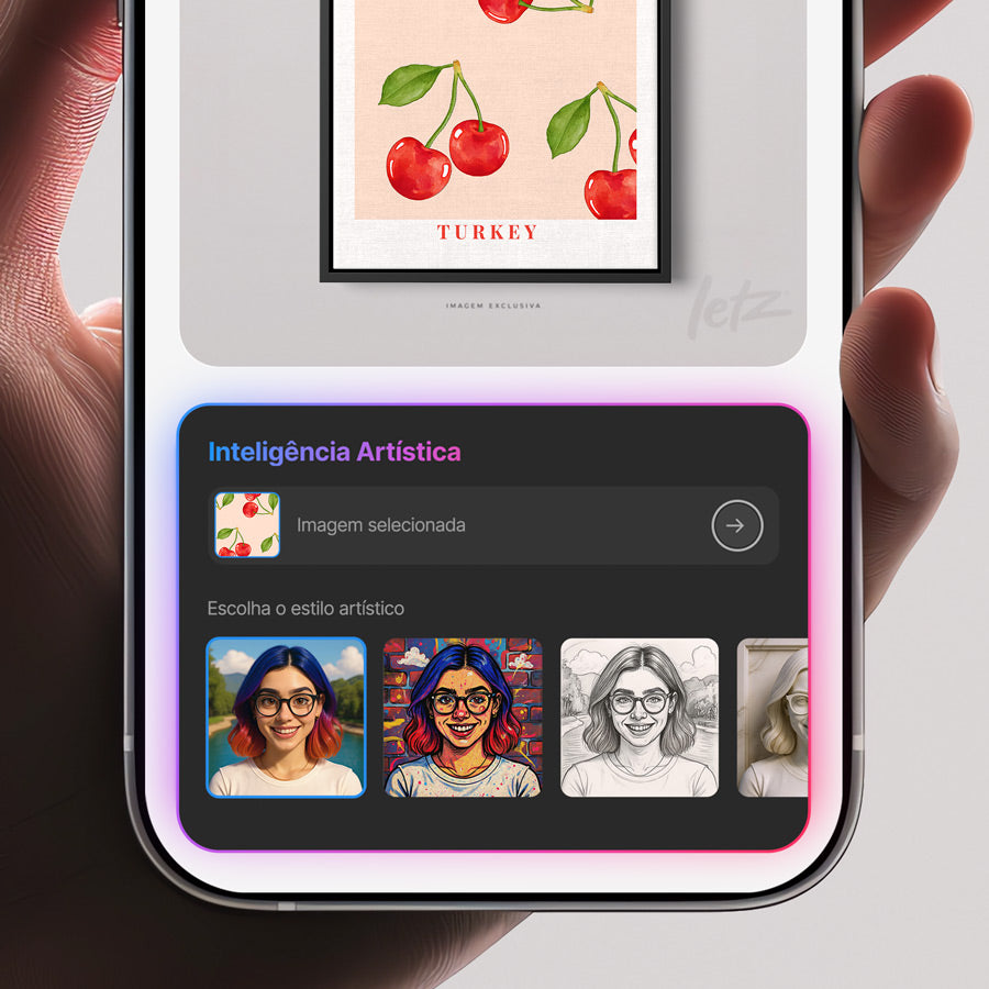O estilo artístico escolhido é aplicado à imagem desejada. A Inteligência Artística cria versões únicas, destacando frutas vibrantes em sua decoração.