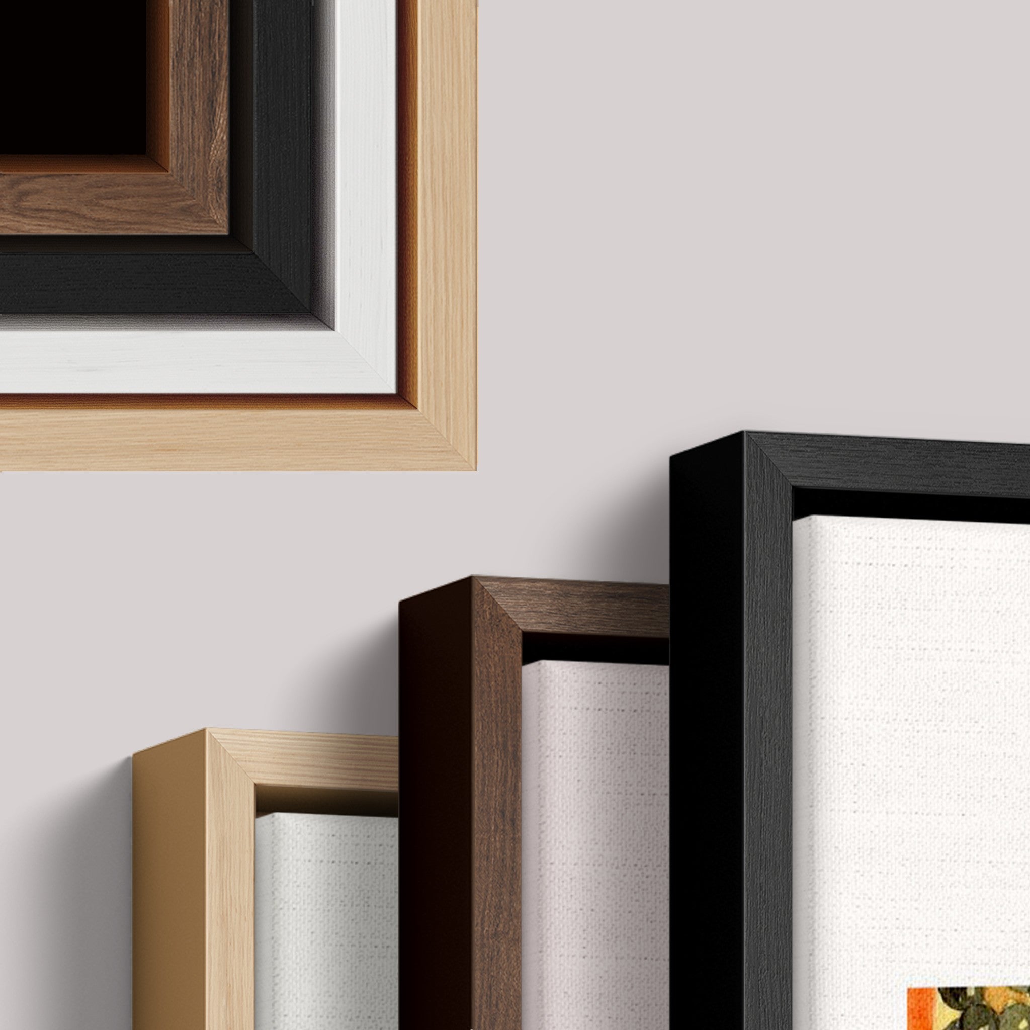 Escolha entre Moldura Flutuante, Caixa, Filete ou Canvas. Todas com Acabamento Premium em madeira ecológica e design contemporâneo.