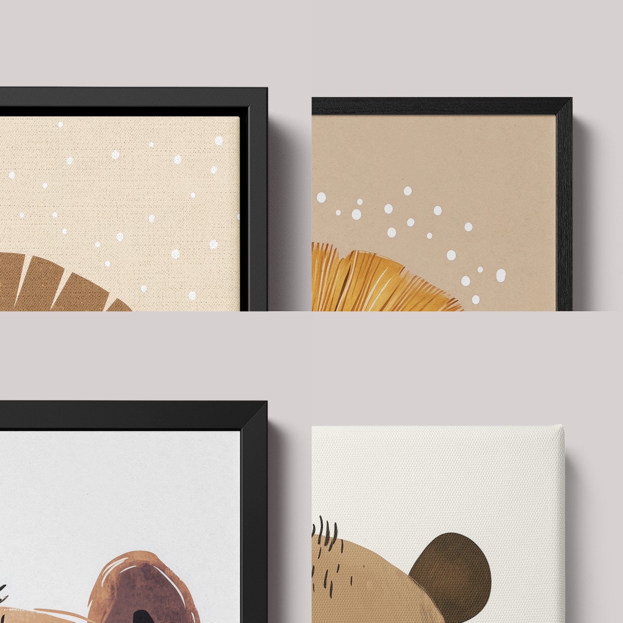 Entre canvas e moldura, os detalhes revelam elegância e profundidade, enriquecendo a beleza dos animais minimalistas.